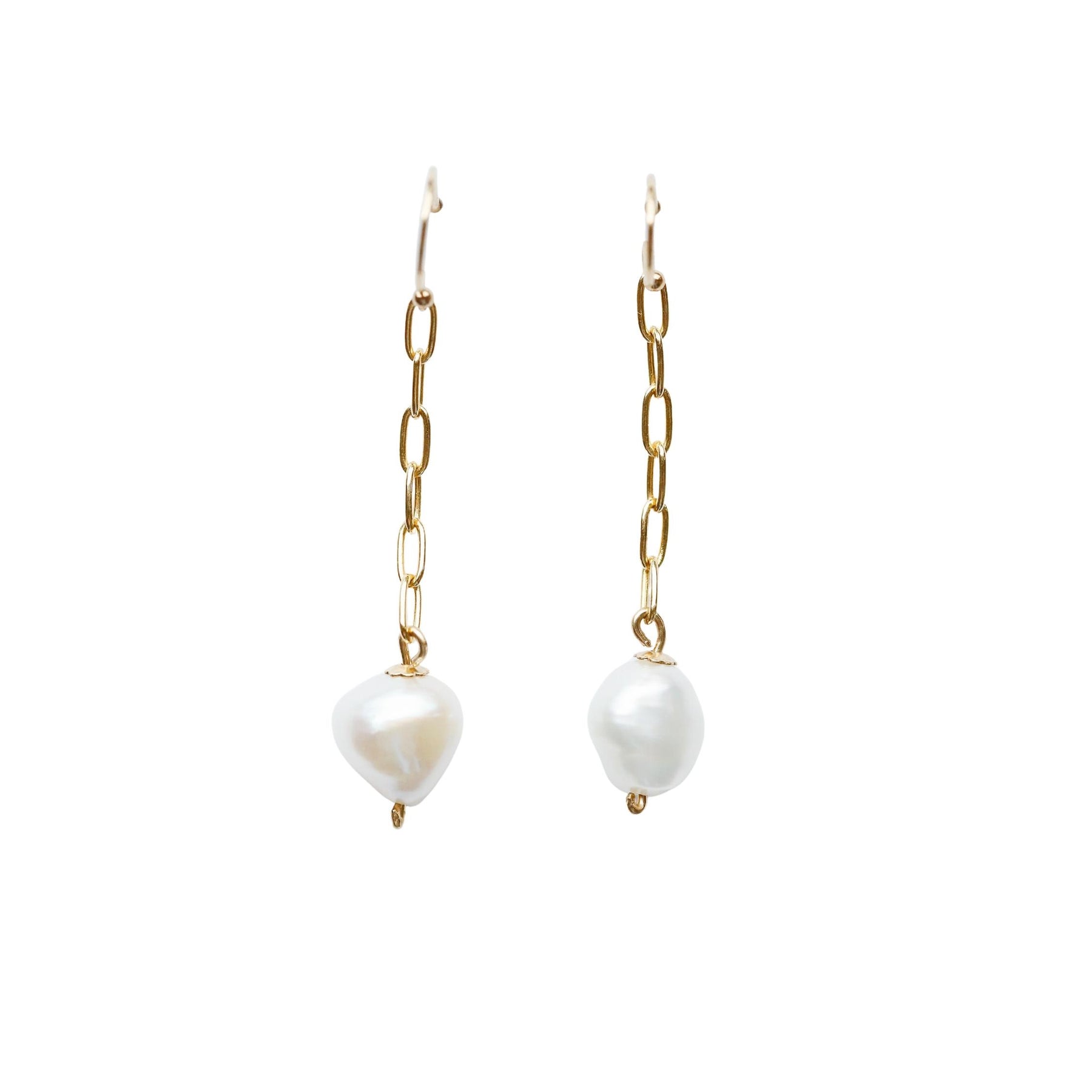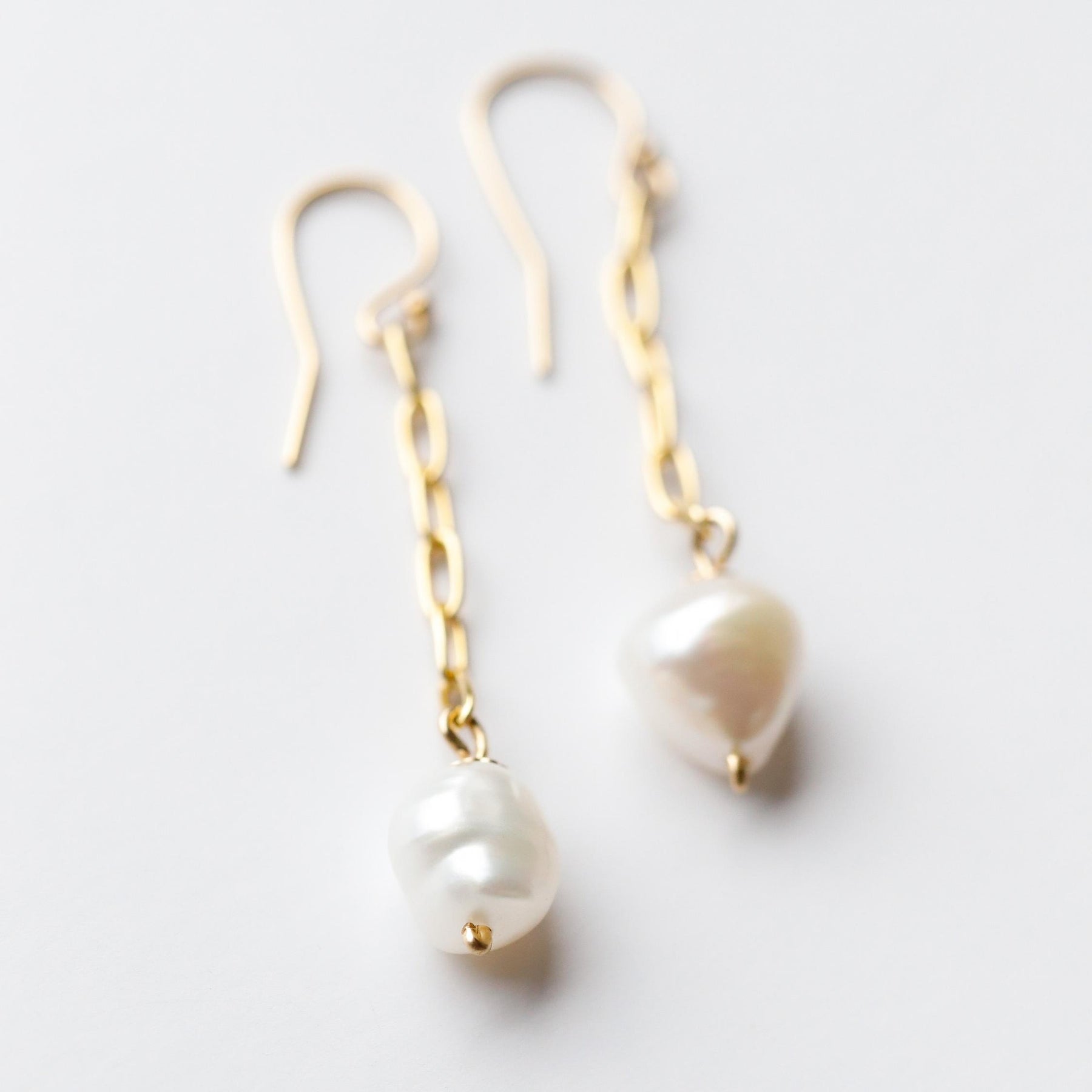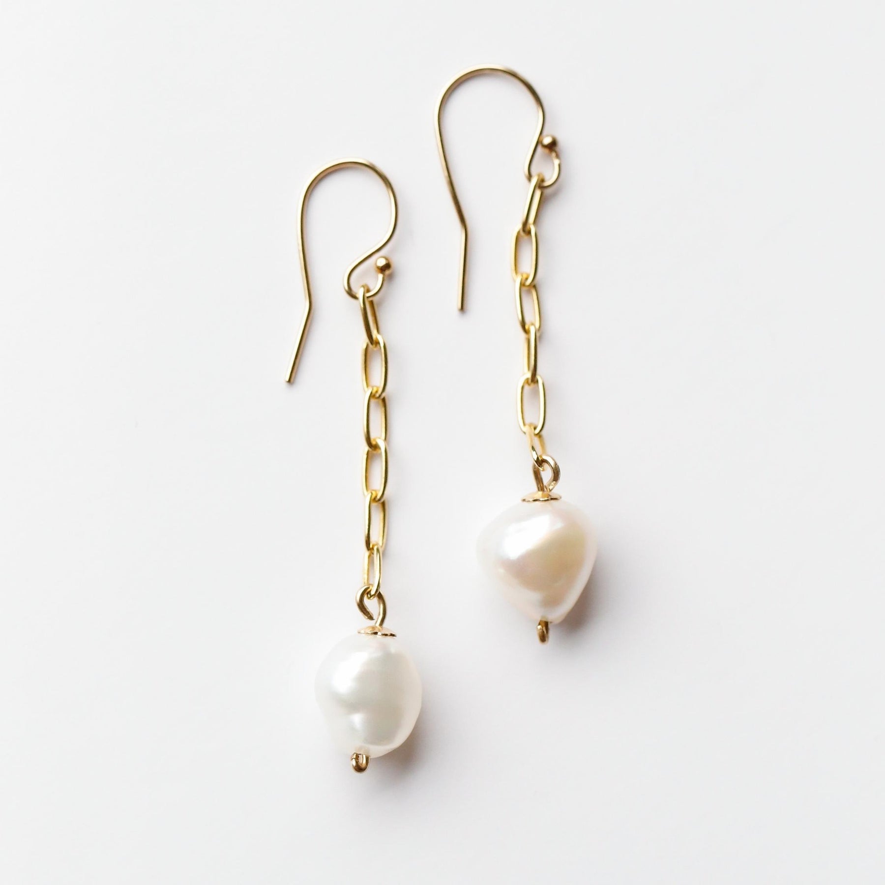 These pearl drop earrings are a must-have. Each pearl is unique in shape and natural colour suspended on an elegant gold chain and hook. They are the perfect finish for any ensemble.